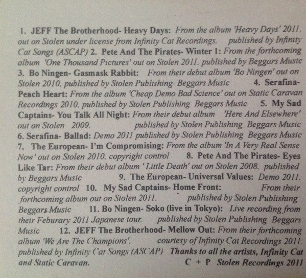 Handprinted silk screened CDr presented in a gatefold card slipcase with folded A4 lyric sheet. 6 Stolen Records artists for Record Store Day. 12 Songs - one new and one classic from Stolen Recordings. Limited to 200 copies for UK and Eire.